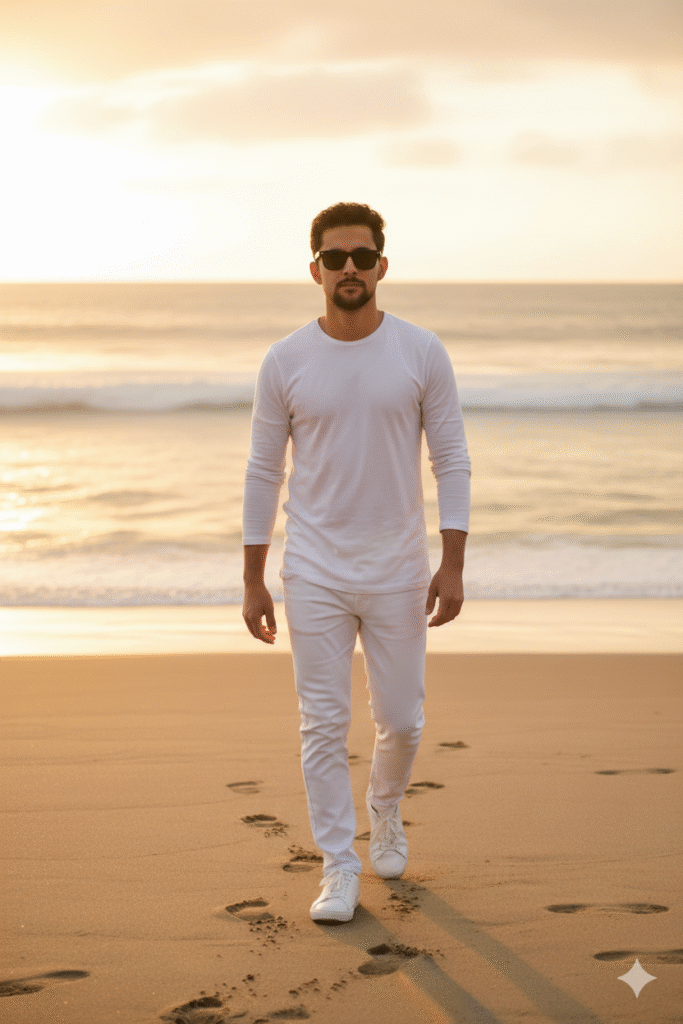 Full body shot of a young man, early 20s, with a lean build and short, curly dark hair, styled naturally. He is walking towards the viewer on a sandy beach at sunset, with soft, golden light. Outfit: plain white long-sleeved t-shirt, white trousers, white sneakers. Neutral expression, looking directly at the camera. Background: gentle ocean waves, warm light, footprints in the sand. Perspective: eye-level, full figure in the center of the frame. Don’t change the face, make sure the face is the same.