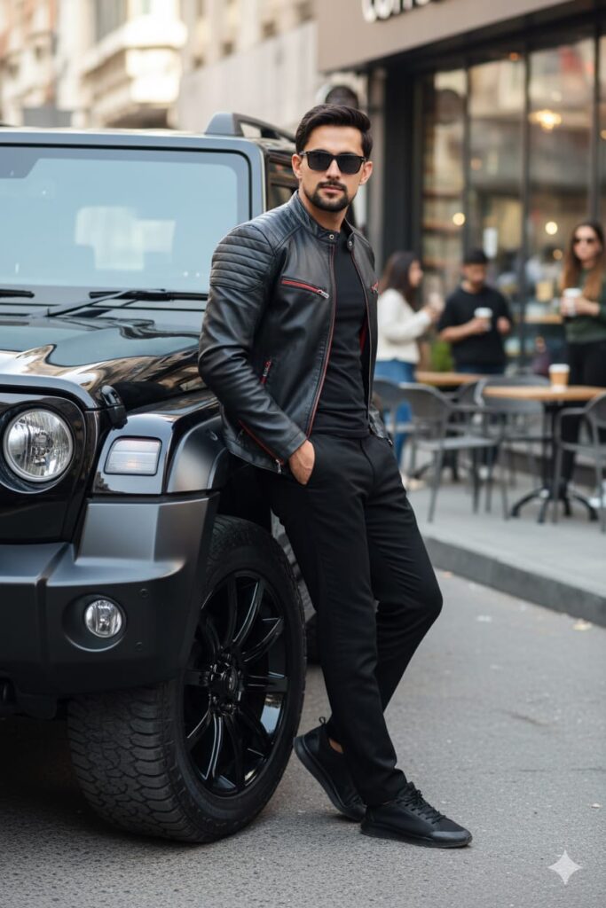 “Ultra-realistic, cinematic full-body portrait of a stylish young man, with the exact facial features from the uploaded reference image, hairstyle perfectly matching the reference image and flawlessly styled, facing directly toward the camera. He wears dark sunglasses, a striking black-and-red leather jacket over a plain black t-shirt, fitted black trousers, and sleek black sneakers. Pose: leaning lightly on the front side of the luxury black Mahindra Thar SUV, one shoulder touching the car, one hand in pocket, the other resting casually on the ear hood, head slightly angled for a stylish candid look, exuding relaxed confidence. The Mahindra Thar features massive custom alloy wheels and rugged off-road tires, with hyper-detailed reflections and gloss on the car body.