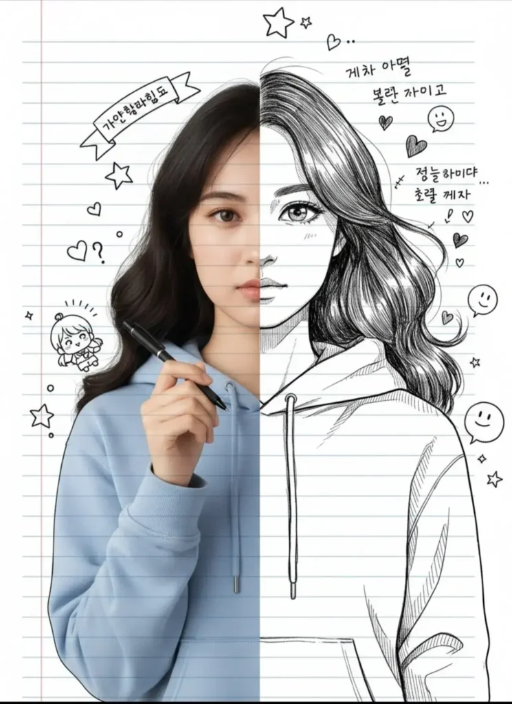 A young (Photo of character as attached image matches 100%) wearing a light blue hoodie, holding a black pen, standing against a lined notebook paper background. The image is split vertically in half: the left side is a realistic photo, the right side is a detailed black-and-white sketch drawing in manga/comic style. The sketched side includes doodles like stars, hearts, smiley faces, and small cartoon figures around the head. The sketch also has handwritten Korean words and playful decorations. The real side blends smoothly into the drawn side, creating a half-human half-doodle art effect. Clean, aesthetic, creative, modern illustration style.”: •Style keywords: “mixed media, half drawing half real, sketchbook art, aesthetic doodle, creative portrait” •Lighting: soft, natural, studio-like