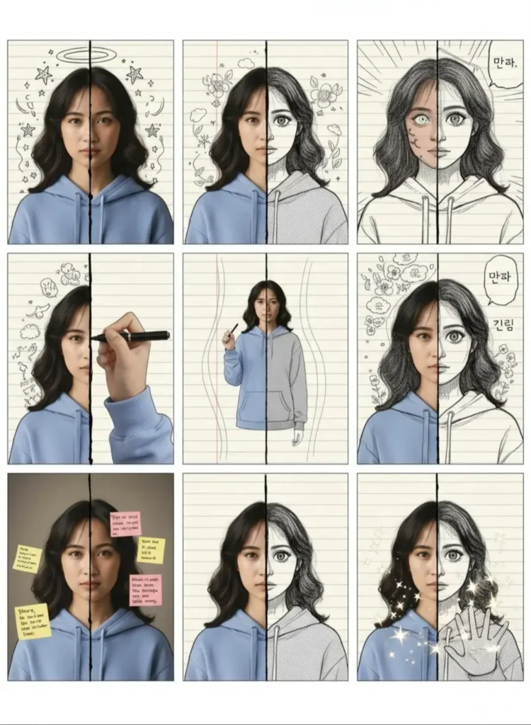 Editorial 3×3 photo grid against a lined notebook paper backdrop, split vertically: left half realistic photo, right half detailed black-and-white manga/comic sketch. Photo of character as attached image matches 100%, wearing a light blue hoodie and holding a black pen. The real side blends smoothly into the drawn side, creating a half-human half-doodle art effect with seamless transition across the split. Lighting is soft, natural, studio-like for clean skin tones and gentle shadows. Shots to include: (1) close frontal at center, vertical split through face; left side photoreal, right side manga sketch with doodle halo of stars, hearts, smiley faces, and tiny cartoon figures (85mm, f/2.0); (2) 3/4 body with pen lifted near split edge, ink strokes crossing into the sketch side mid-air (50mm, f/2.8); (3) extreme close-up of eye at the split, iris on photo side and screentone/shaded eye on sketch side (85mm, f/1.8); (4) tight crop on hand holding black pen, pen tip drawing the boundary line between real and sketch (85mm, f/2.2); (5) full-body centered, notebook lines curving subtly toward the sketch half, hoodie texture on photo side, crosshatching on sketch side (35mm, f/5.0); (6) profile view with split through nose bridge, sketch side featuring handwritten Korean words and playful decorations floating (85mm, f/2.0); (7) medium shot with floating doodles orbiting the head on the sketch side while sticky-note style frames overlap into the real side (50mm, f/3.2); (8) tight crop of hoodie fabric transitioning from knit texture to manga screentone pattern at the seam (85mm, f/2.0); (9) medium close with hand extending from real side into sketch side, leaving a trail of drawn sparkles and mini emoticons (50mm, f/2.5). Angles: Mostly eye-level with a few slight low angles for dynamism; maintain clean geometry to emphasize the vertical split. Capture in RAW, professional color grade with soft neutrals and gentle blues; sketch side pure monochrome with crisp linework and halftone textures. Mood: creative, modern, aesthetic sketchbook portrait. Style keywords: mixed media, half drawing half real, sketchbook art, aesthetic doodle, creative portrait. Important: Character and product remain visually identical in every shot. Resolution locked to 1080×1920, vertical 9:16 ratio. Camera: RAW capture, strictly 1080×1920, vertical image (9:16) ratio.