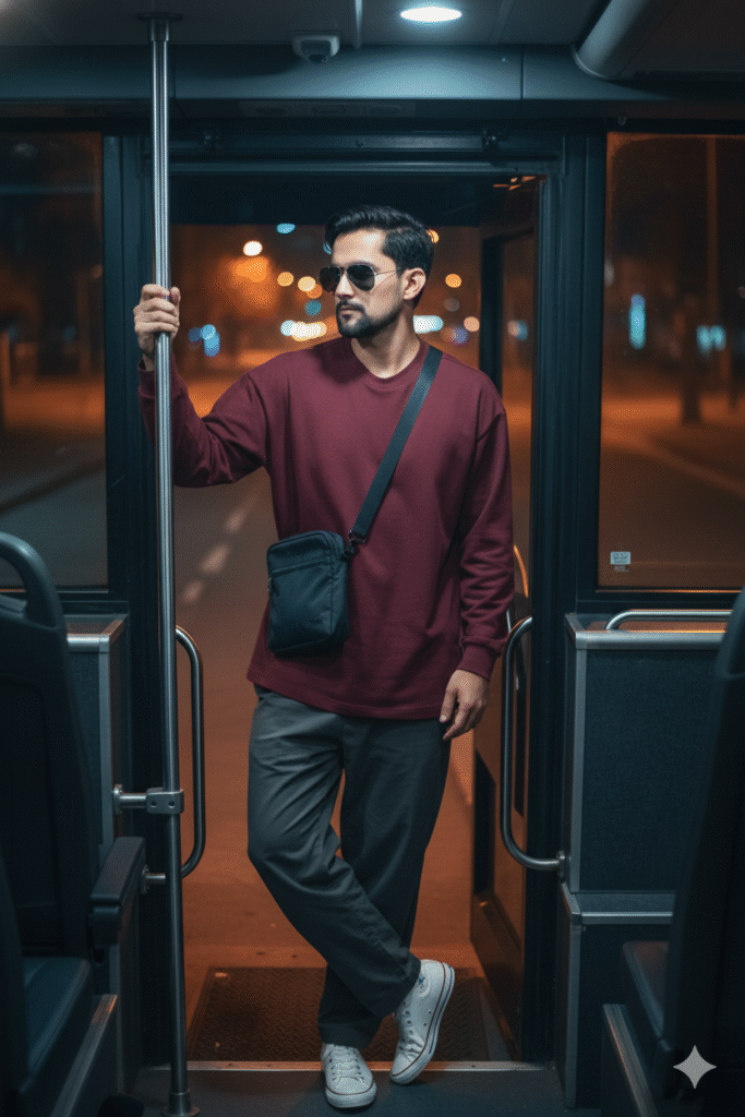 Hyper-realistic overhead 3:4 full-body portrait, young man 25-28 inside luxury bus at night. Leaning on open door, hand on pole, maroon oversized shirt, loose trousers, Converse kicks, sunglasses on collar, sling bag, urban lights casting moody cinematic glow. Sharp focus, shallow depth of field, cinematic color grade, 8K detail. My face and body should be 100% same don’t change it.